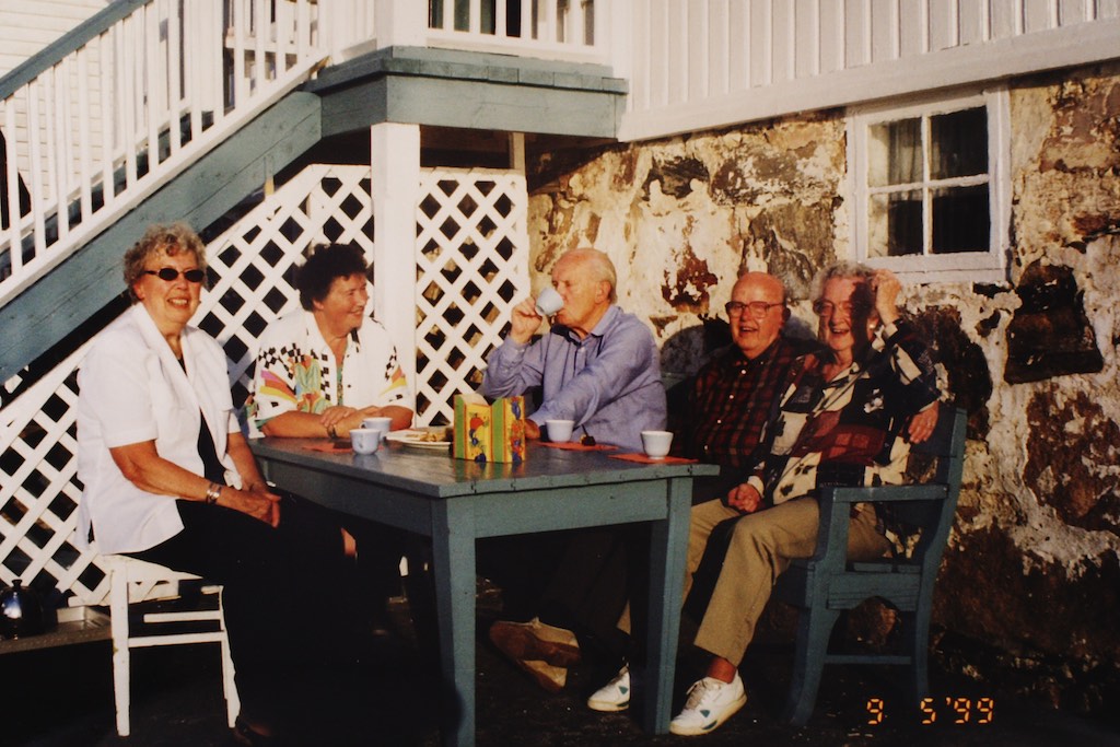 På Svinør i 1999 – F.v. Elisabeth og Hjørdis (barnebarn av Gina Marie), Kjell (min pappa), Fred sen.(barnebarn til Gina Marie) og hans kone Ruth Church