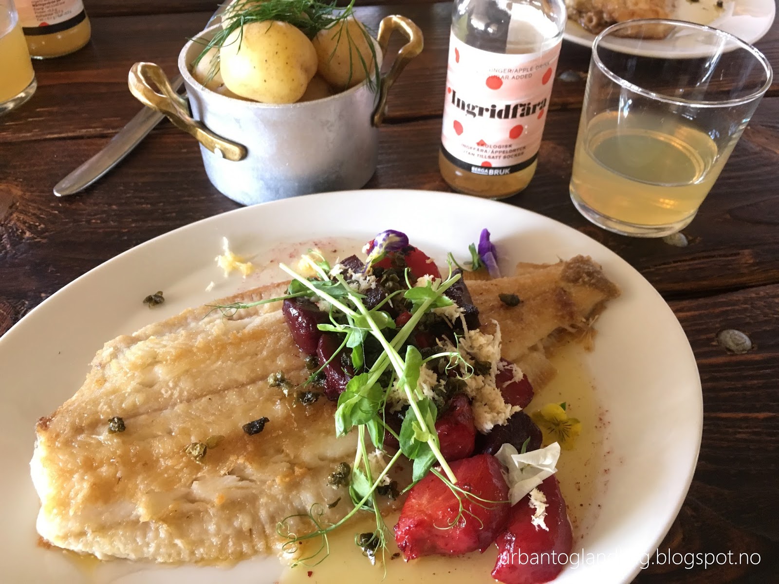 Vi gikk for en flyndrerett med bakte rødbeter, pepperrot og ertespirer, mat for mons. Med en epledrikk tilsatt ingefær fra skafferiet, var måltidet en fulltreffer.